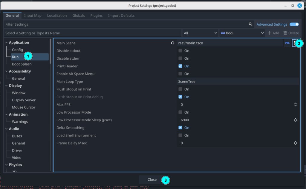 Before we do a test run, we have to set the ‘Main Scene’ in ‘Project Settings’.